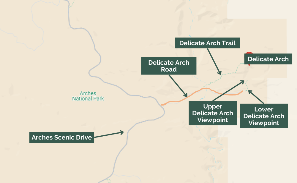 I’ve also pointed out Delicate Arch Road in orange in the map below.